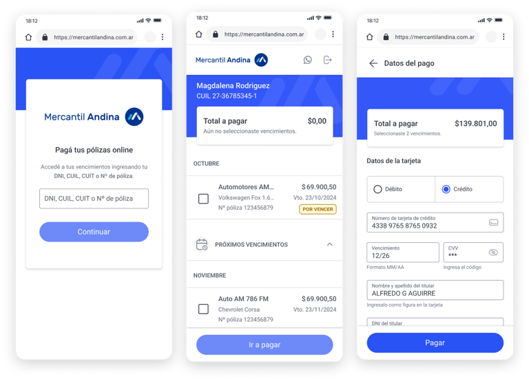 El asegurado puede pagar su póliza fácilmente: Ingresa, selecciona las pólizas e ingresa datos del pago.